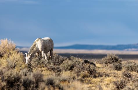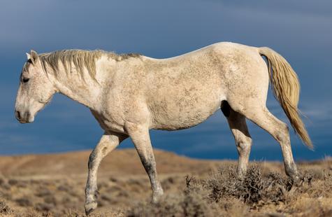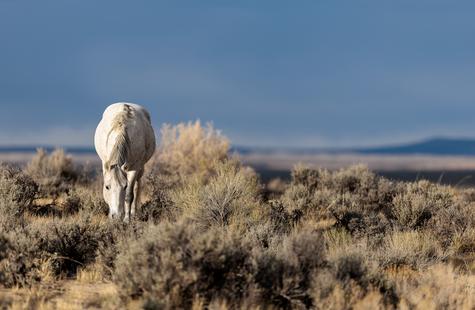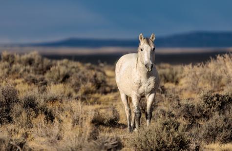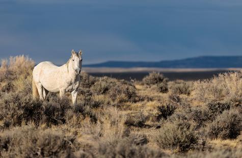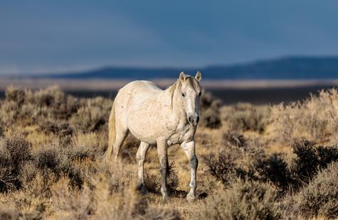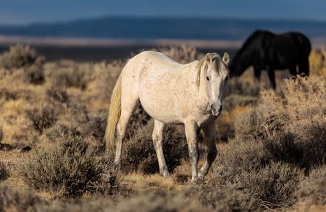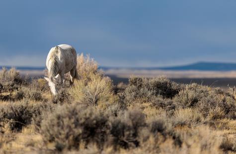 The brown freckles and subtle marks on this white mustang make him easy to remember. I could see him, more than any other horse, looking my direction regularly. He would glance then graze. At first he slowly drifted my way, but soon he just decided to come right over to me. After a brief moment checking me out at close range, he drifted back towards the larger group. An instant later, the light was gone for the day.